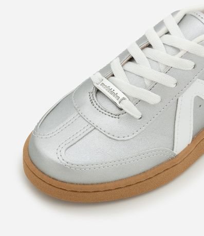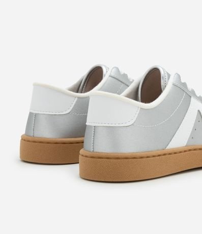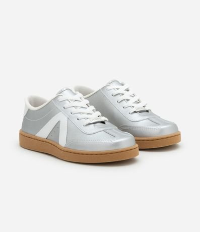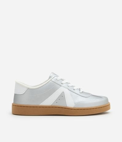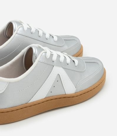 Ref: Tênis confeccionado em pu com bico fino, recorte lateral e sola contrastante.