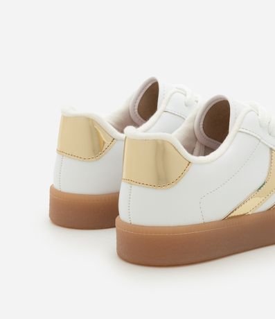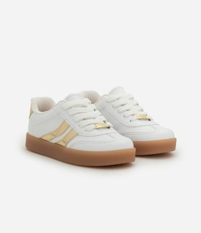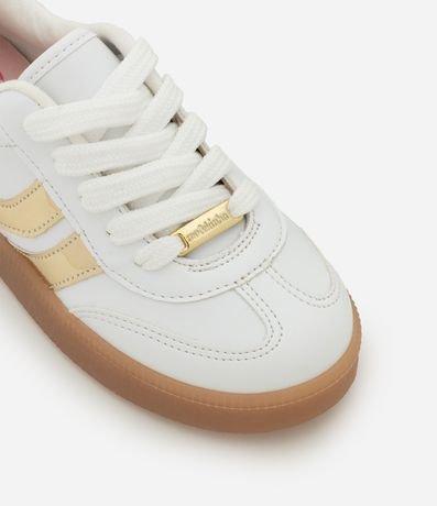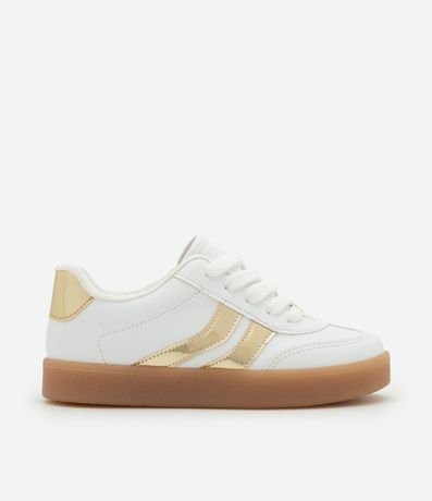Tênis infantil confeccionado em material sintético, possui fechamento por cadarços, bico redondo, cano baixo, solado contrastante e recortes.