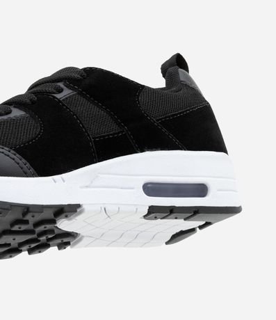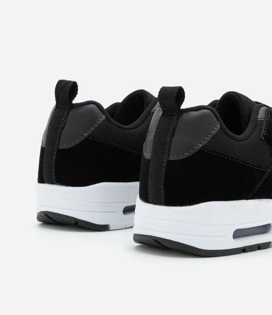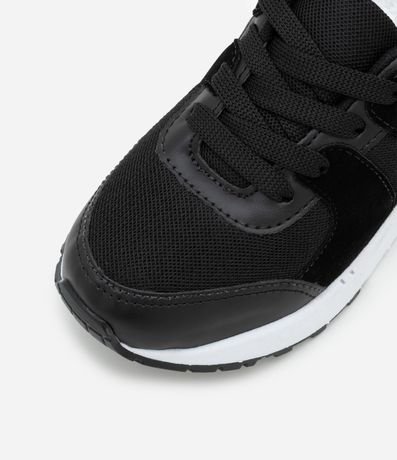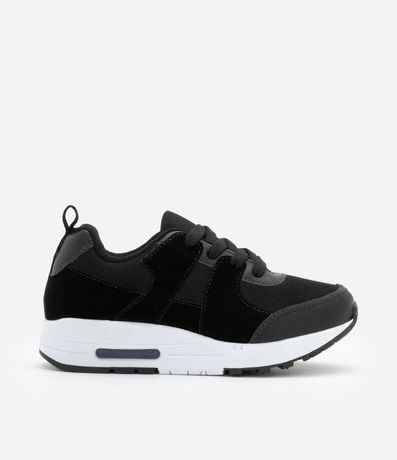 Tênis infantil confeccionado em material sintético. Possui bico redondo, fechamento por cadarços, detalhes em suede e puxador no calcanhar.