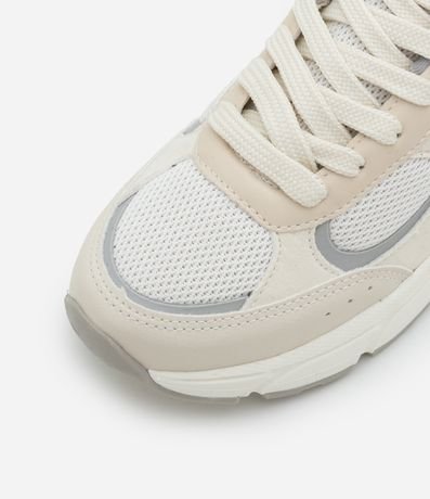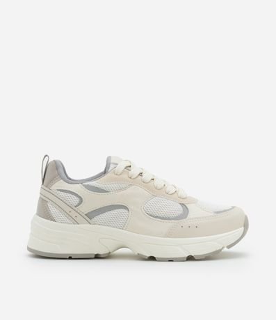 Ref: Tênis infantil esportivo confeccionado em material sintético, peça com bico redondo, cadarço, detalhe de recortes e sola bicolor.