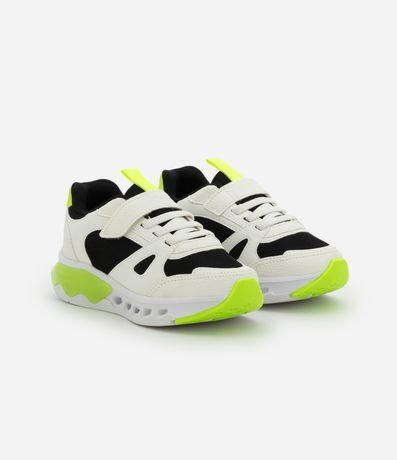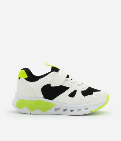 Ref: Tênis infantil confeccionado em material sintético, no modelo esportivo. Possui fechamento por velcro e cadarços, bico redondo, com atacador, cano baixo, sola bicolor, com led e recortes contrastantes.