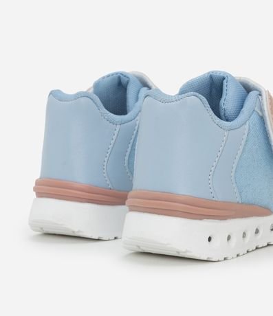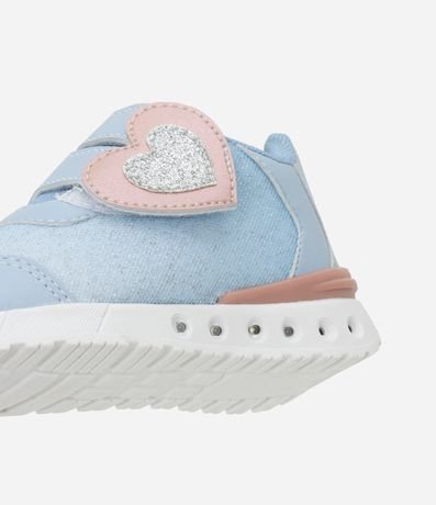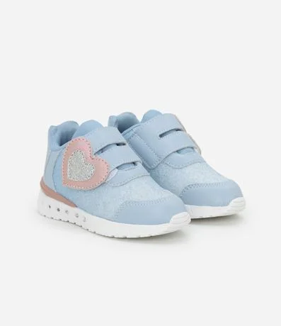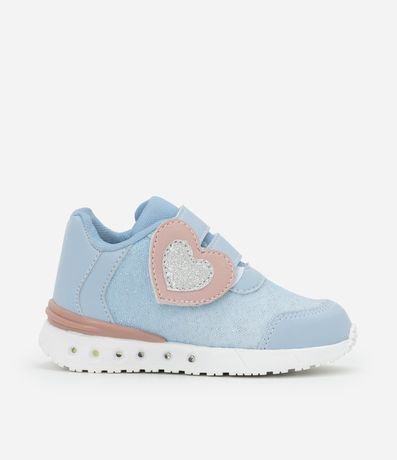 Tênis infantil confeccionado com material sintético, cano baixo, recortes, glitter aplicado, fechamento por velcro com estampa coração e sola com luzinha LED.