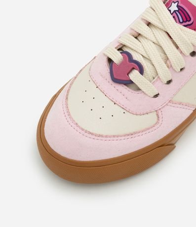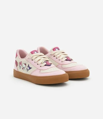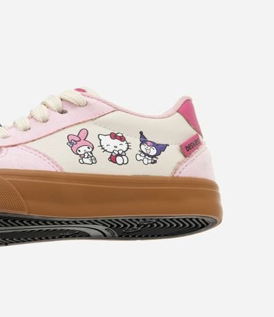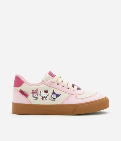 Ref: Tênis infantil confeccionado em material sintético, com bico redondo, recortes contrastantes e estampa da Hello Kitty. Possui fechamento por cadarço.