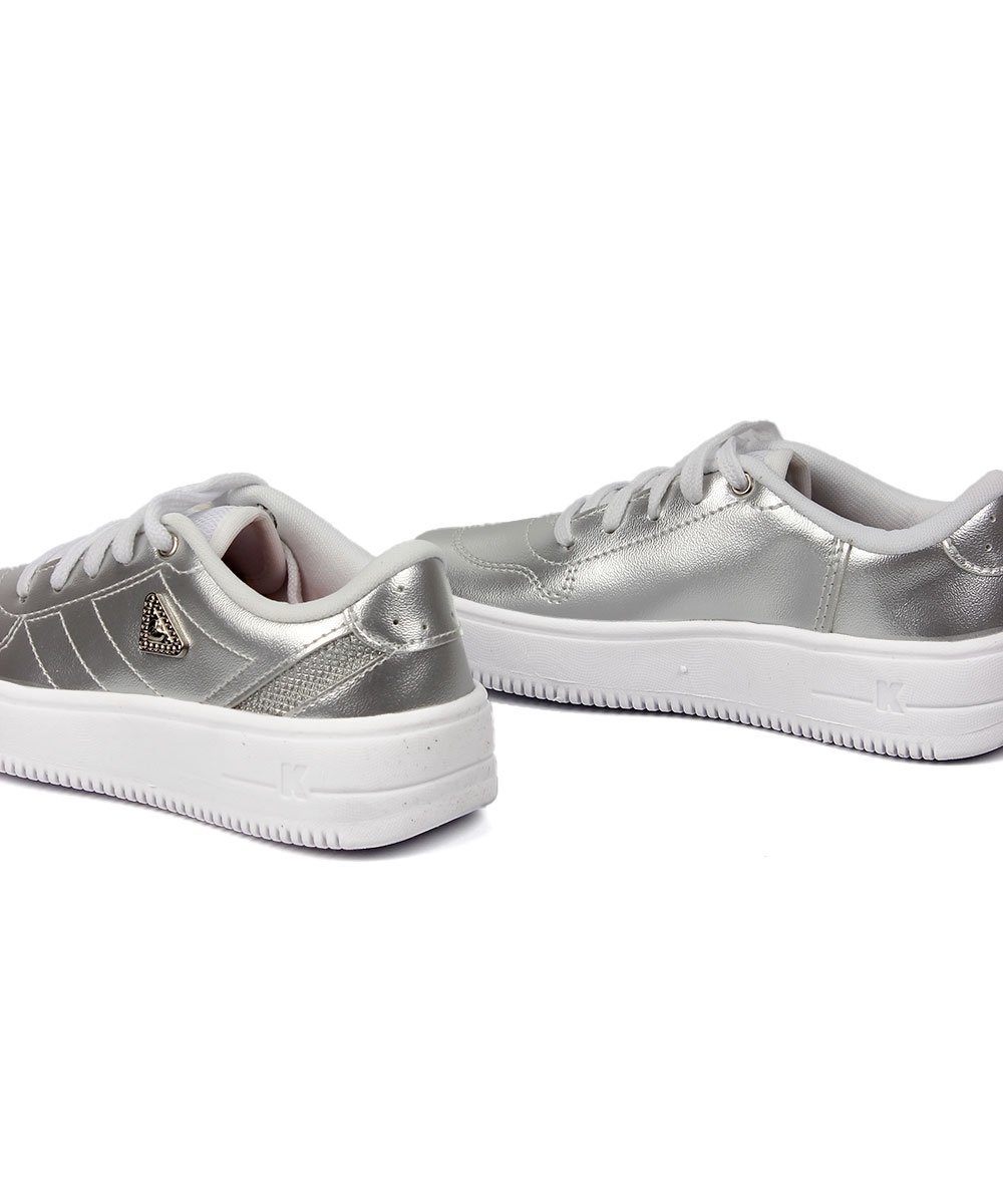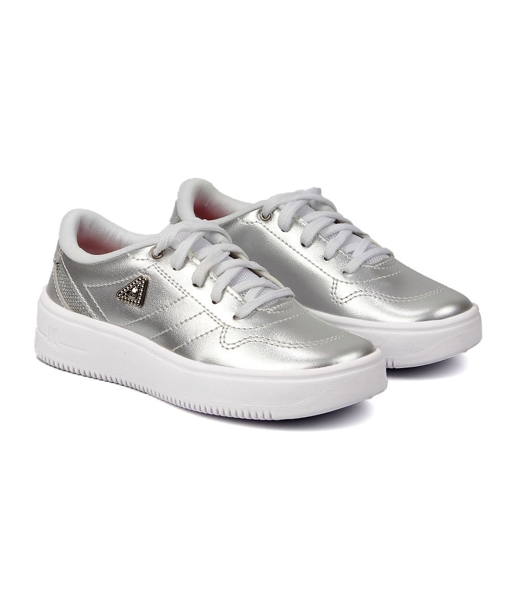 O fechamento em cadarço permite ajuste firme e personalizado. O grande destaque do modelo fica por conta do cabedal com acabamento metalizado, que traz sofisticação ao visual, além de um recorte em strass na parte traseira e um adereço metálico delicado na lateral, que conferem um toque especial ao design.
