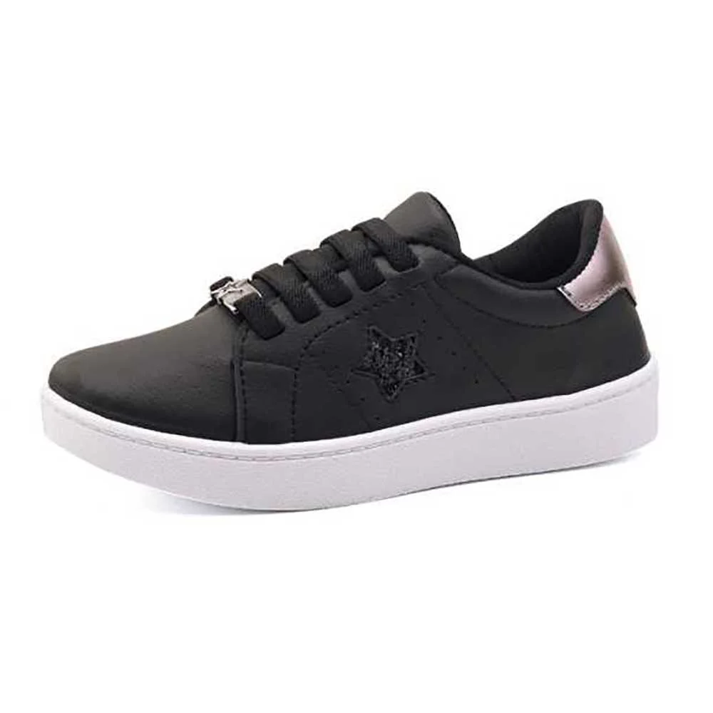 O Tênis Infantil Menina Izalu Casual é a escolha ideal para o dia a dia das pequenas que buscam estilo e conforto. Com design moderno e acabamento em cor preta com detalhe metalizado no calcanhar, o modelo traz um visual versátil para combinar com diversos looks. A estrela bordada na lateral e o detalhe metalizado no cadarço adicionam um toque de charme. Feito com material resistente e solado emborrachado, oferece segurança e durabilidade para o uso escolar, passeios e momentos de lazer.