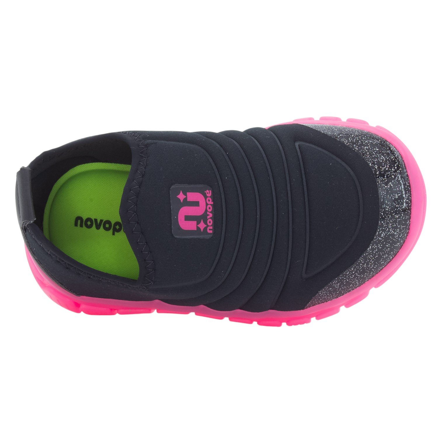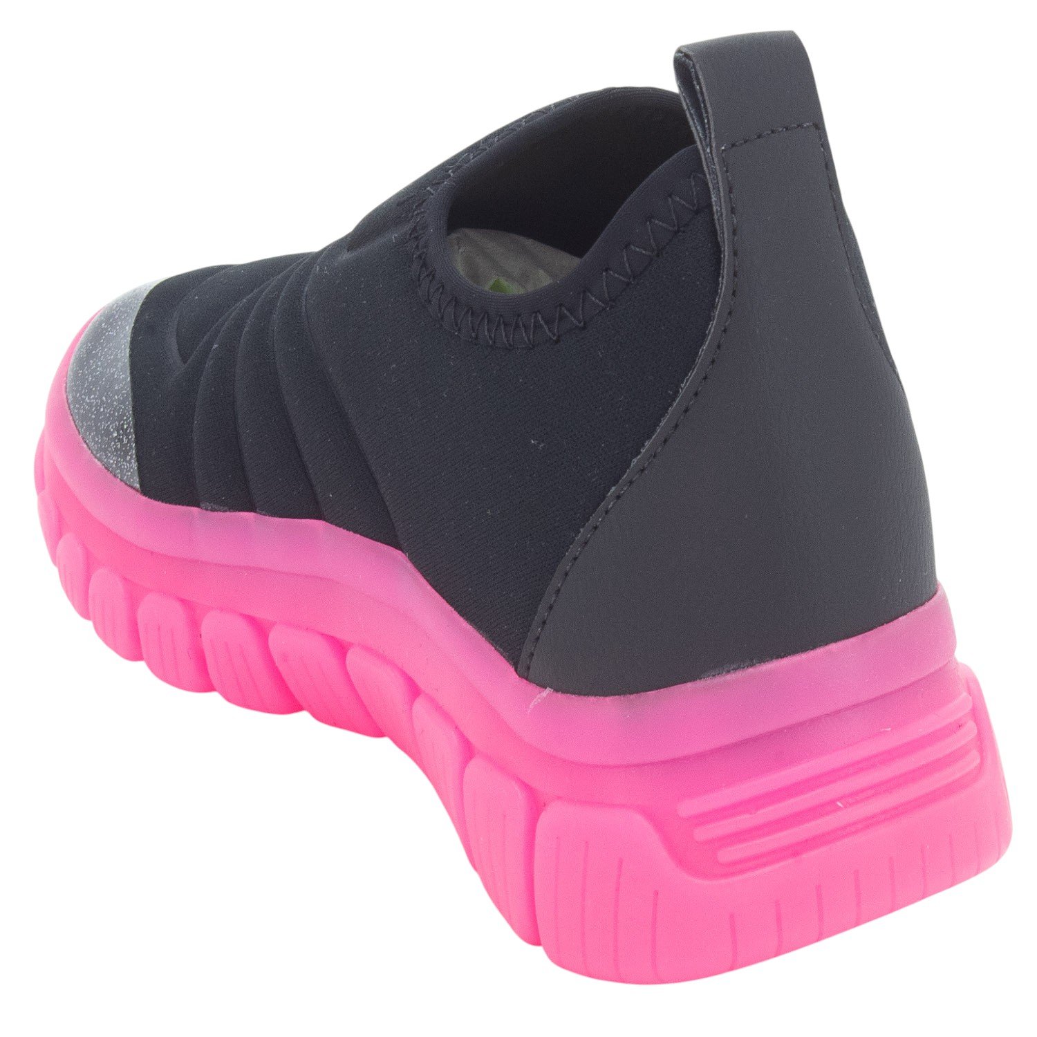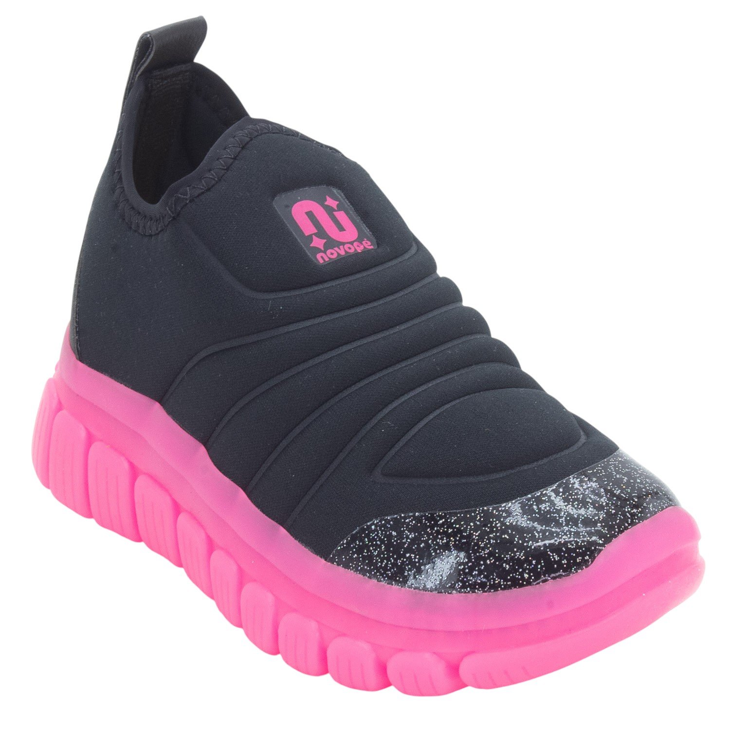 Ref: O Tênis Casual Infantil Menina Novopé 99001204 Preto/Pink é a escolha perfeita para acompanhar as pequenas com muito estilo e conforto. Confeccionado em material sintético de alta qualidade na cor preta, este modelo slip-on (sem cadarço) apresenta um design moderno com linhas em relevo na parte superior. O grande destaque fica por conta da vibrante sola em PVC na cor rosa neon/pink. Robusta, flexível e com um formato tratorado, ela garante excelente aderência e durabilidade, como visto nas imagens da sola. A ponteira do tênis é adornada com um material brilhante e glitterizado em tom escuro, adicionando um toque de charme e sofisticação. Na parte superior, a lingueta integrada exibe a logo da marca Novopé em rosa neon, harmonizando com a cor da sola. O calce é extremamente fácil e prático, graças ao design elástico e à alça de puxar no calcanhar, facilitando a autonomia das crianças. A palmilha interna, em um vibrante verde neon, proporciona um contraste interessante e um conforto extra. Leve, flexível e super confortável, este tênis é o calçado ideal para todas as aventuras das crianças, garantindo segurança e estilo em cada passo. A qualidade do produto é atestada pela gravação "FABRICADO NO BRASIL" visível na sola.