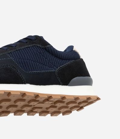 Tênis masculino, confeccionado em material sintético, com cadarço para ajustes, textura e recortes.