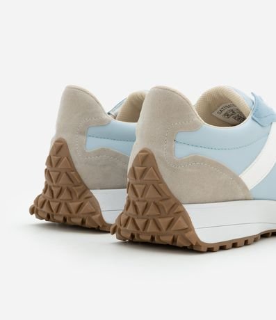 Ref: Par de tênis femininos modelo jogging. O calçado tem cabedal em PU com recortes contrastantes e sola de PVC que se alonga até o calcanhar.