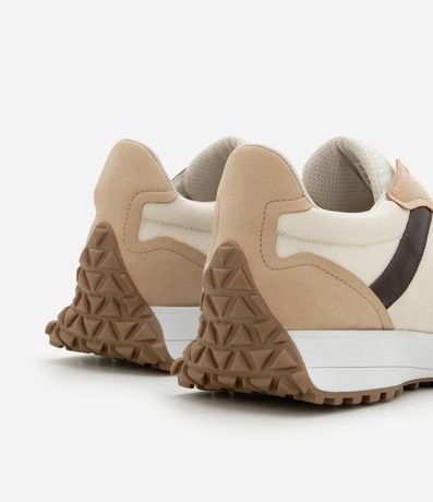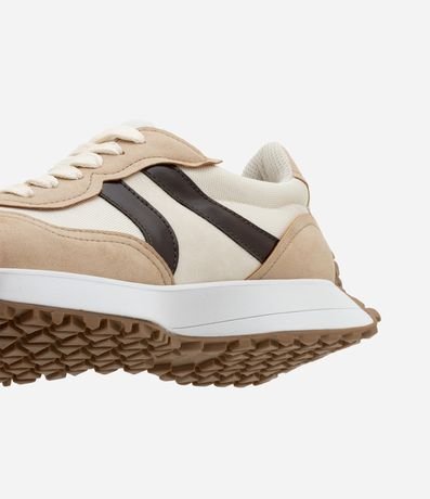 Ref: Par de tênis femininos modelo jogging. O calçado tem cabedal em PU com recortes contrastantes e sola de PVC que se alonga até o calcanhar.