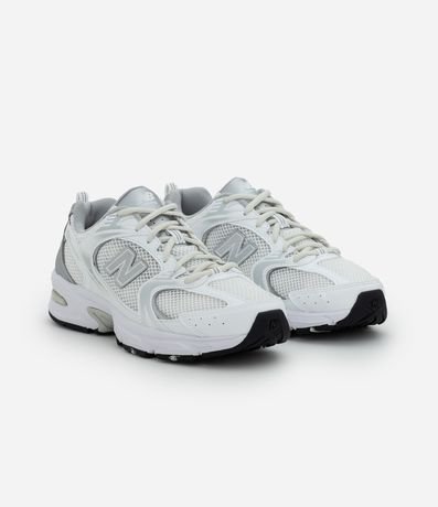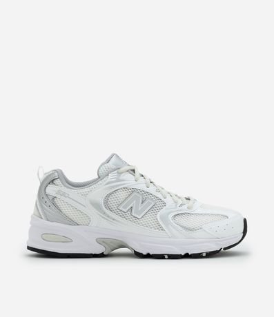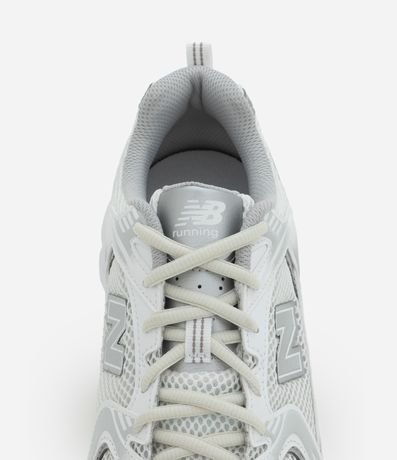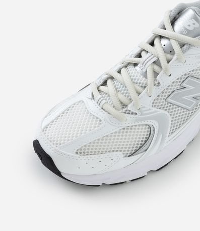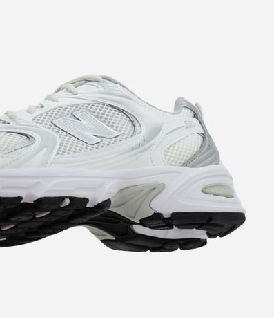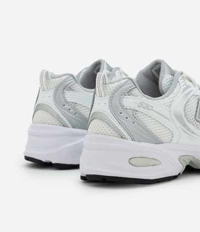 Ref: Tênis no modelo jogging com bico redondo, atacador, cadarço, furinhos, recortes. Peça com cano baixo, sola contrastante no modelo 530 New Balance.