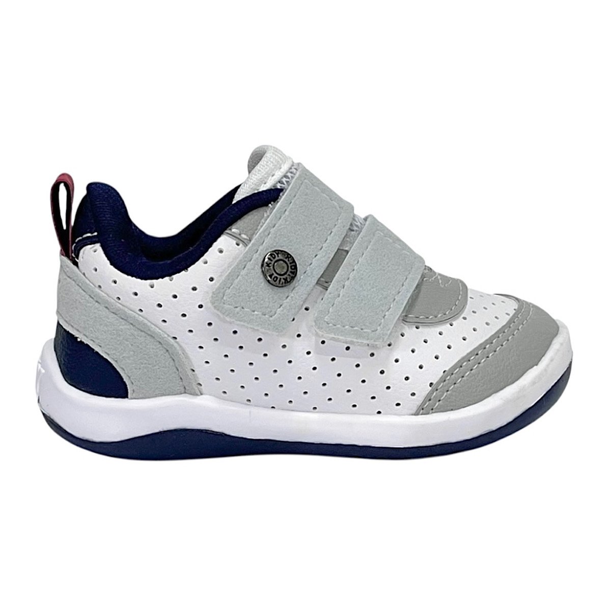 Ref: Pensado especialmente para acompanhar os primeiros passinhos, o Tênis Infantil Kidy Baby Colors Equilíbrio oferece conforto, segurança e estabilidade em uma fase essencial do desenvolvimento infantil. Na combinação de branco com detalhes em cinza e marinho, o modelo apresenta visual delicado e versátil, ideal para o dia a dia dos pequenos.