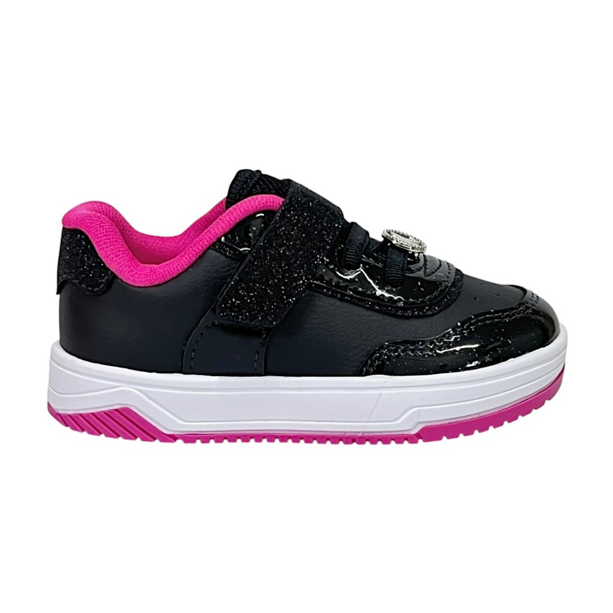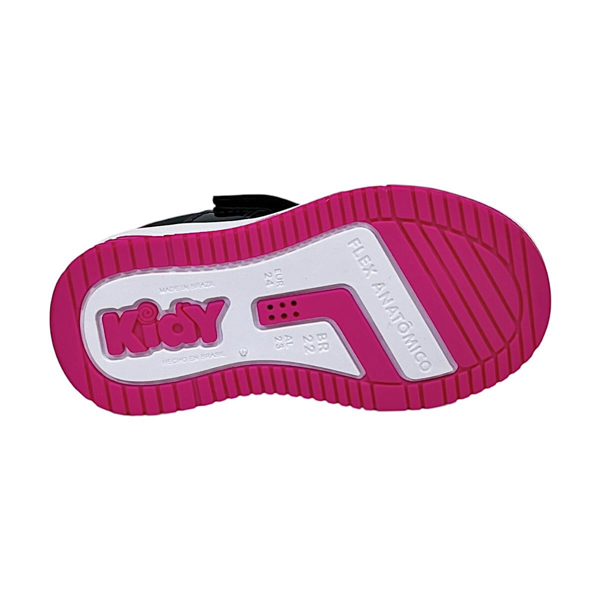Ref: O Tênis Infantil Kidy Happy na cor preto com detalhes em pink é ideal para meninas que gostam de estilo e brilho em um calçado confortável para o dia a dia. O modelo combina napa com detalhes em verniz e glitter, trazendo um visual moderno e cheio de personalidade. O cabedal conta com a tecnologia Respi-tec, que auxilia na ventilação interna e ajuda a manter os pés mais confortáveis durante o uso prolongado. O fechamento com elásticos e fita aderente proporciona ajuste prático e facilita o calce, incentivando a independência das pequenas. Como detalhe especial, o tênis conta com um pin metálico decorativo com a logo da Kidy aplicado na parte superior do cabedal, agregando charme e exclusividade ao design. O forro em cacharrel garante toque macio e aconchegante, enquanto a palmilha super macia possui formato que acompanha o contorno dos pés, proporcionando bem-estar durante o uso. O solado em borracha antiderrapante oferece estabilidade e segurança para acompanhar a rotina com conforto e confiança.