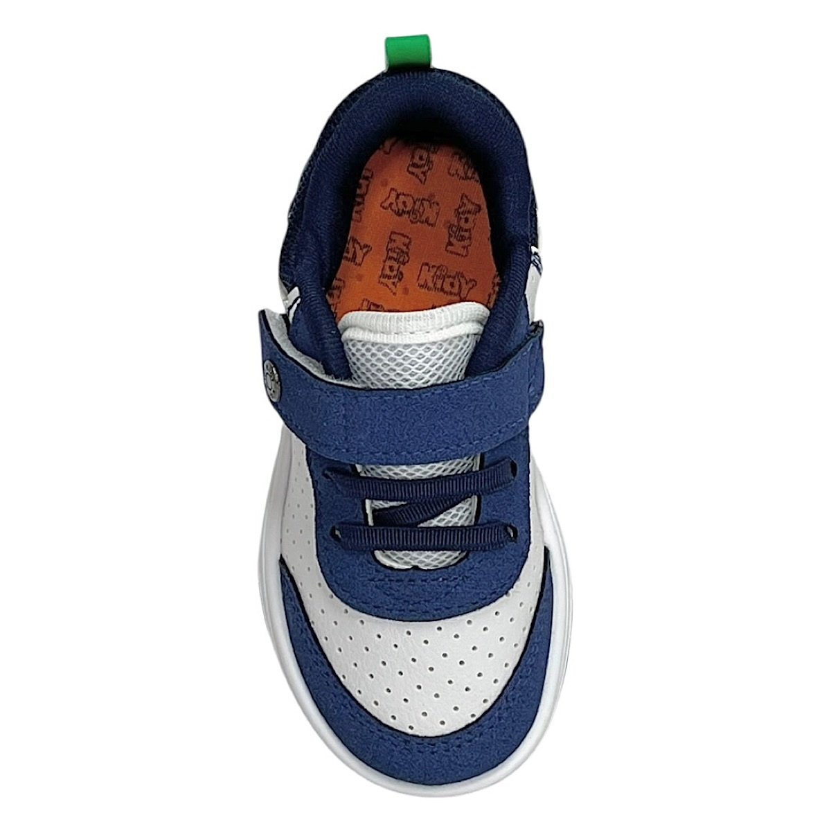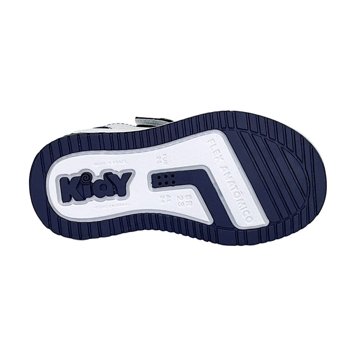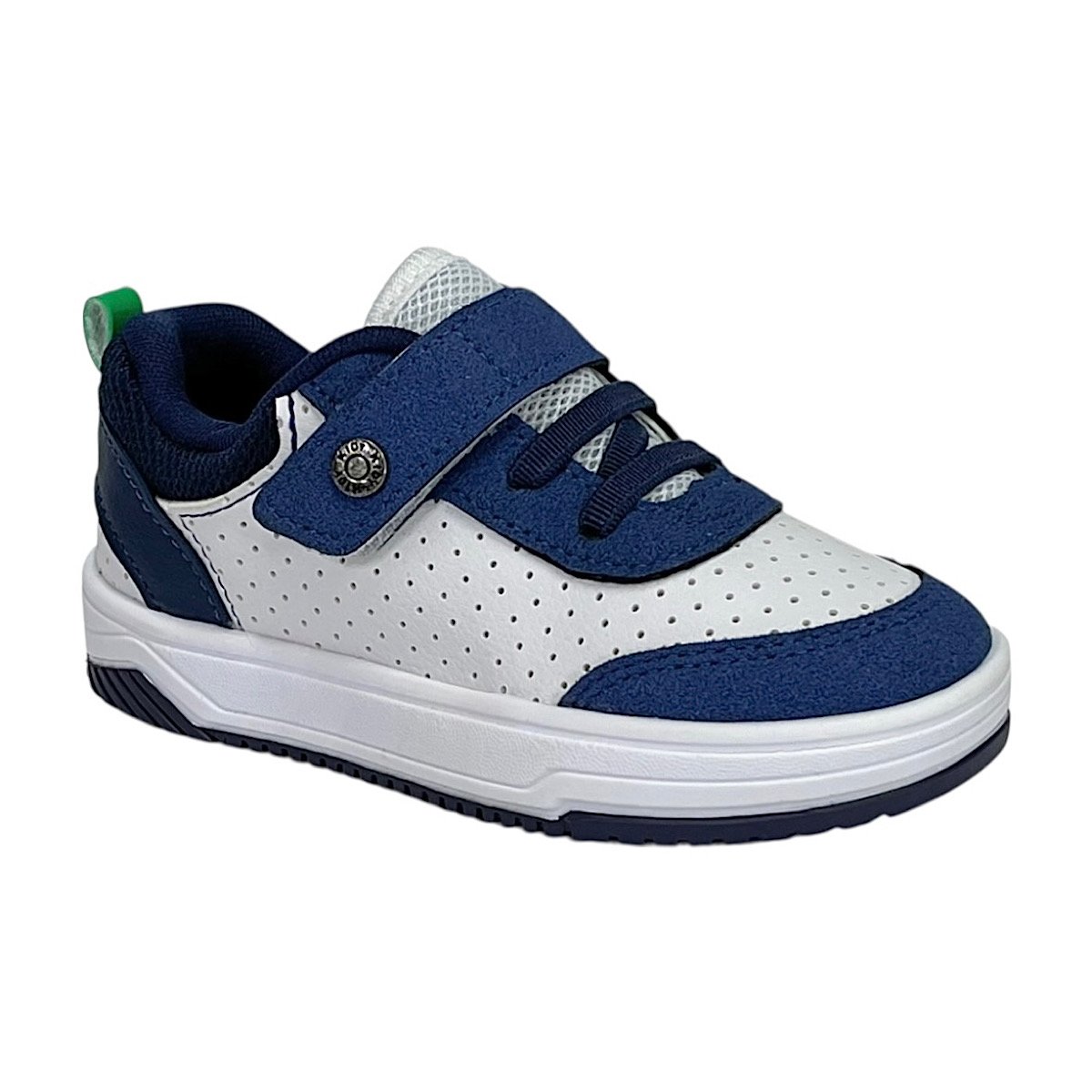 Ref: O Tênis Infantil Kidy Happy na cor branco com detalhes em marinho e verde é ideal para meninos que precisam de conforto, segurança e praticidade para acompanhar todas as aventuras do dia a dia. O modelo apresenta um design esportivo e moderno, combinando resistência e leveza. Seu cabedal em material sintético possui micro perfuros que favorecem a respirabilidade dos pés, aliado à tecnologia Respi-tec, que auxilia na circulação de ar interna e ajuda a manter o conforto durante o uso prolongado. O fechamento com elásticos e fita aderente facilita o calce e promove ajuste firme e prático, incentivando a independência da criança. Como diferencial, o tênis conta com o pin metálico decorativo com a logo da Kidy aplicado na lateral, junto à fita aderente, agregando personalidade ao modelo. O forro em cacharrel proporciona toque macio e aconchegante, enquanto a palmilha super macia possui formato que acompanha o contorno dos pés, oferecendo bem-estar a cada passo. O solado em borracha antiderrapante garante estabilidade e segurança para brincar e caminhar com tranquilidade.