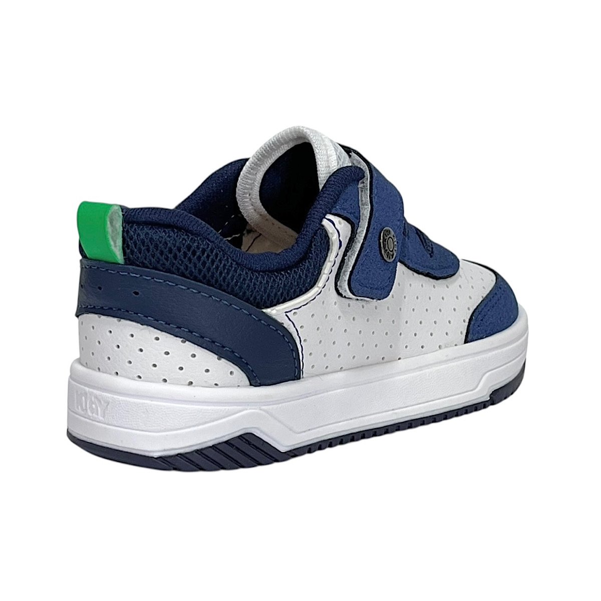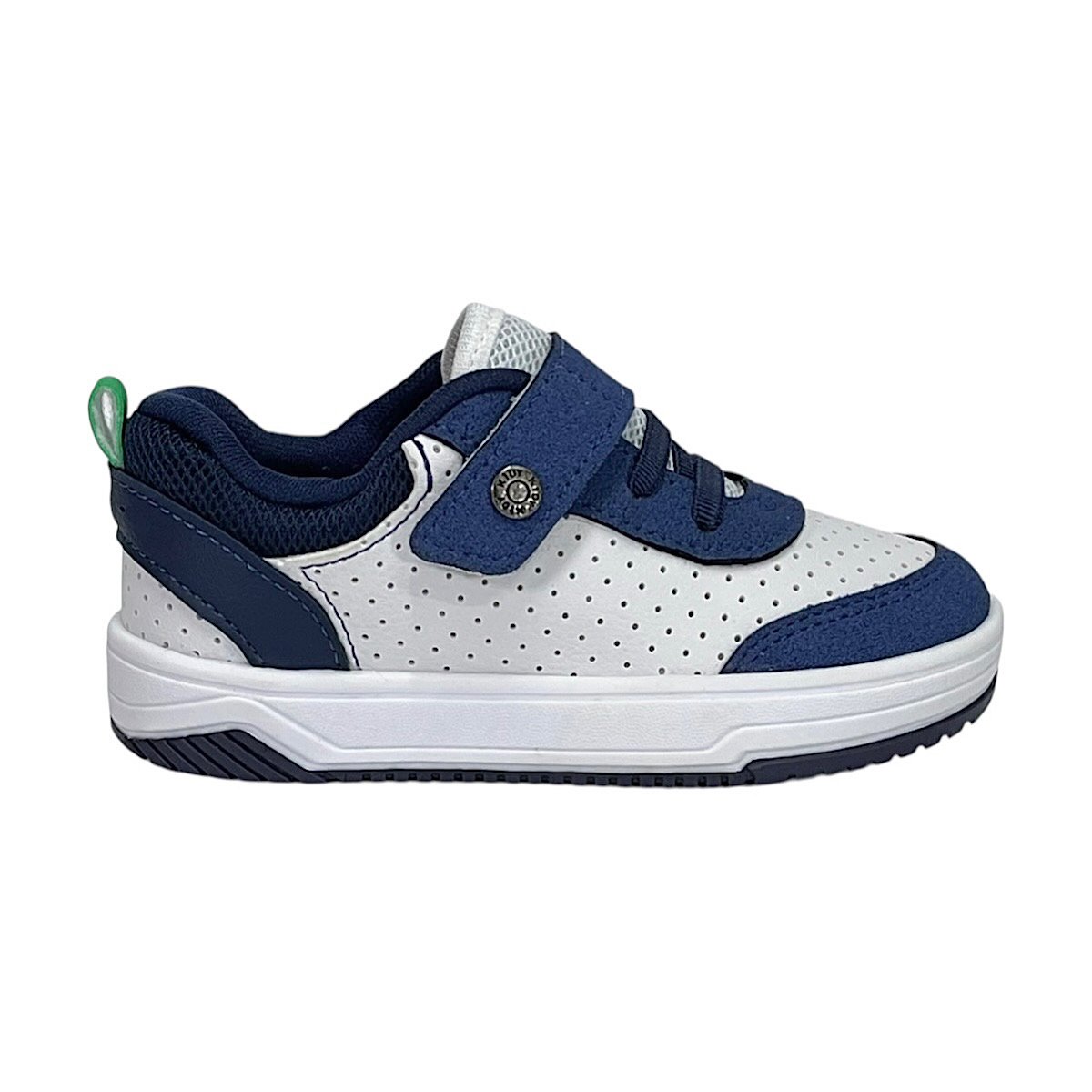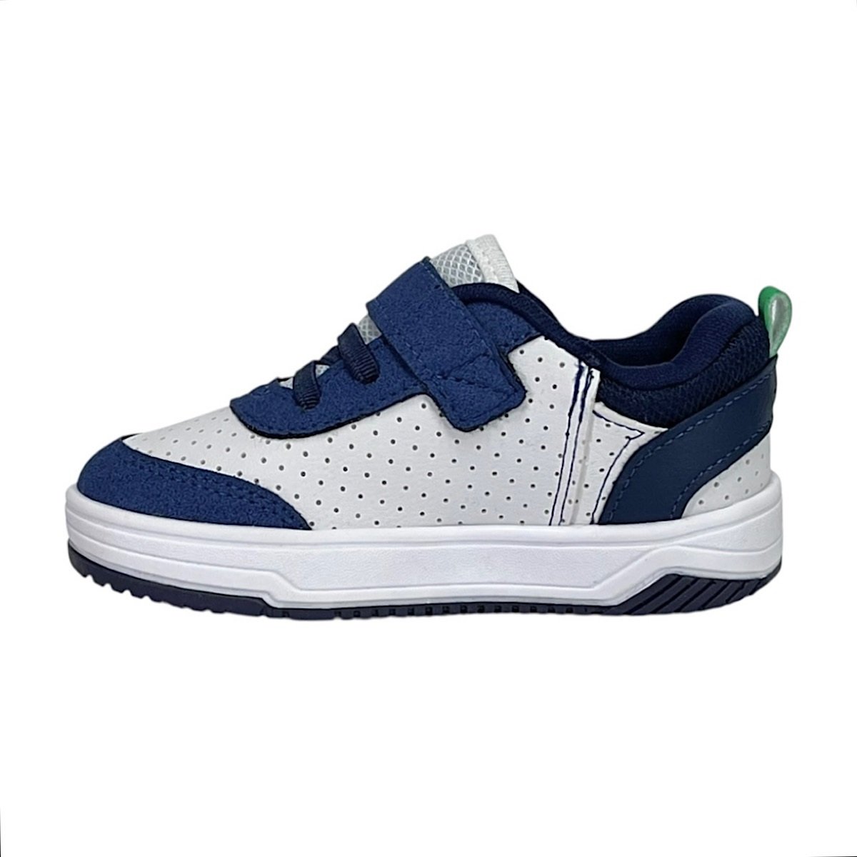 Ref: O Tênis Infantil Kidy Happy na cor branco com detalhes em marinho e verde é ideal para meninos que precisam de conforto, segurança e praticidade para acompanhar todas as aventuras do dia a dia. O modelo apresenta um design esportivo e moderno, combinando resistência e leveza. Seu cabedal em material sintético possui micro perfuros que favorecem a respirabilidade dos pés, aliado à tecnologia Respi-tec, que auxilia na circulação de ar interna e ajuda a manter o conforto durante o uso prolongado. O fechamento com elásticos e fita aderente facilita o calce e promove ajuste firme e prático, incentivando a independência da criança. Como diferencial, o tênis conta com o pin metálico decorativo com a logo da Kidy aplicado na lateral, junto à fita aderente, agregando personalidade ao modelo. O forro em cacharrel proporciona toque macio e aconchegante, enquanto a palmilha super macia possui formato que acompanha o contorno dos pés, oferecendo bem-estar a cada passo. O solado em borracha antiderrapante garante estabilidade e segurança para brincar e caminhar com tranquilidade.