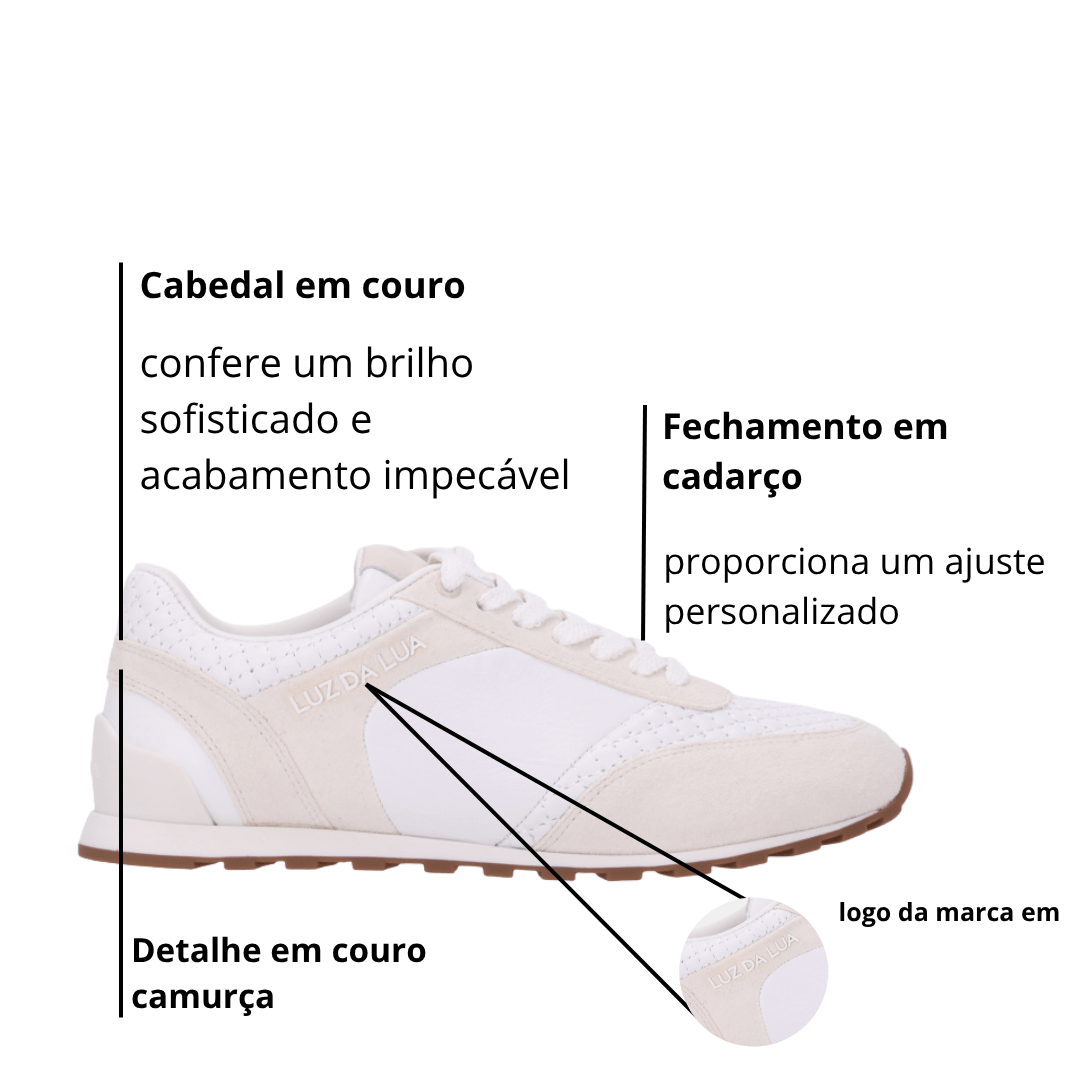 Combine o Tênis Luz da Lua com jeans, vestidos leves ou alfaiataria casual para um visual sofisticado e atual. É ideal para o trabalho, passeios ou viagens, oferecendo um toque refinado sem abrir mão do conforto.