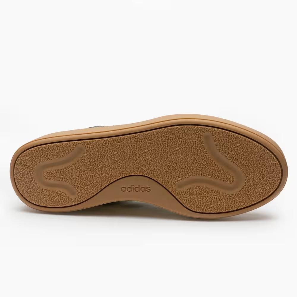 As icônicas três listras da Adidas, símbolo de reconhecimento global da marca, aparecem na lateral em um tom de cinza escuro, proporcionando um contraste sutil e sofisticado..