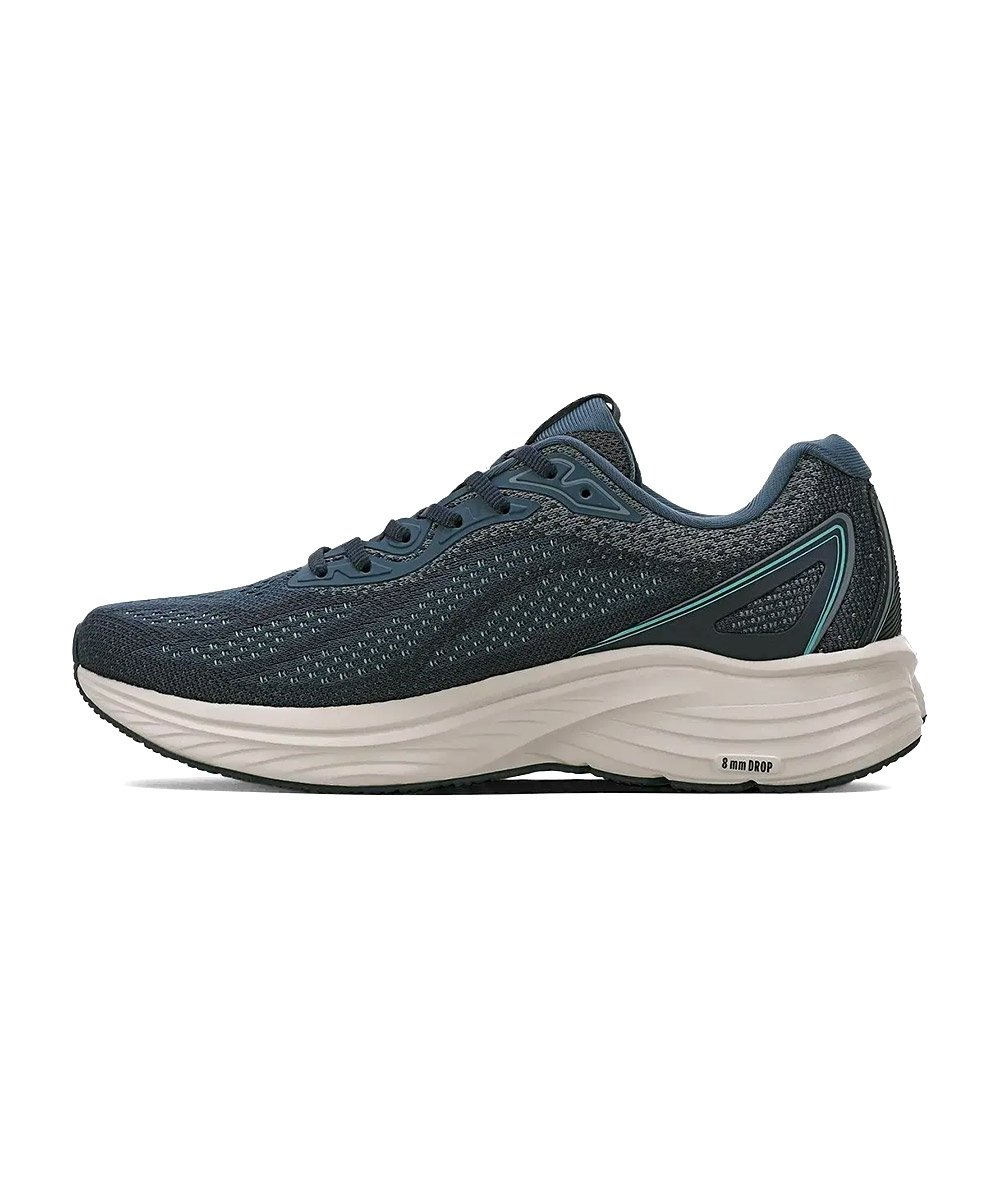 O atacador é composto por tecido poliéster texturizado, o forro é feito de tecido poliéster com espuma para conforto adicional, e a palmilha anatômica combina tecido poliéster e EVA para suporte aos pés durante toda a corrida.
