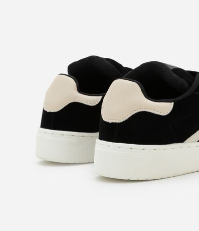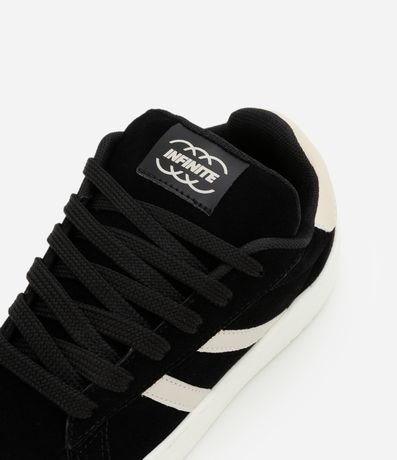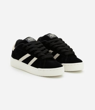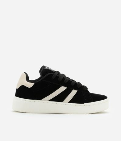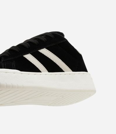 Ref: Tênis infantil de modelo skater com de cano baixo, solado baixo, fechamento por cadarço e detalhe de listras contrastantes nas laterais.