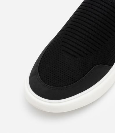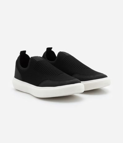 Ref: Tênis masculino, em material sintético, no modelo slip on. Modelo contém detalhes em recortes com bico redondo, sem fechamento e solado contrastante.