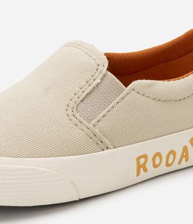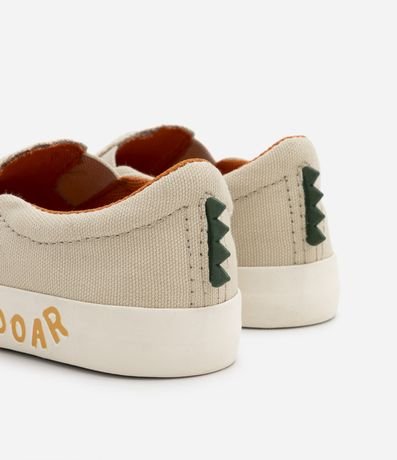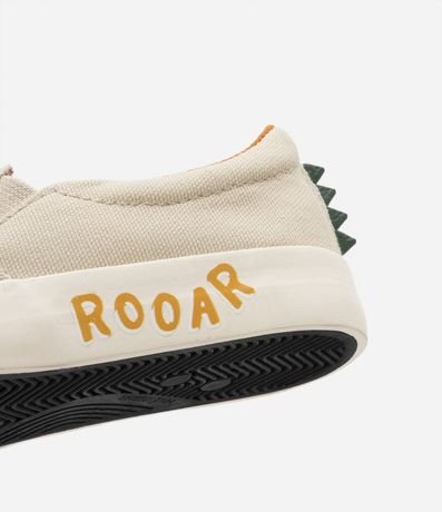 Ref: Tênis infantil, de modelo slip on, em lona, com estampa lettering "roar" e detalhe de crista de dino no calcanhar.