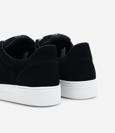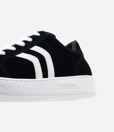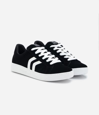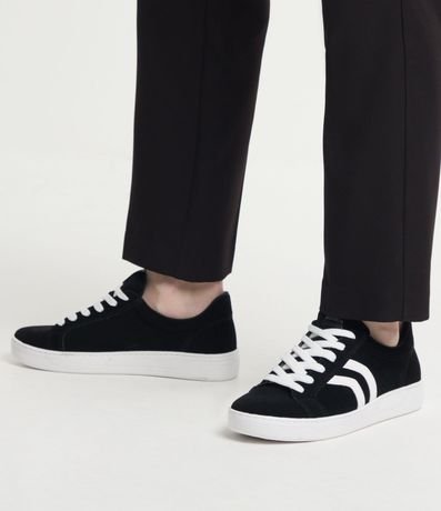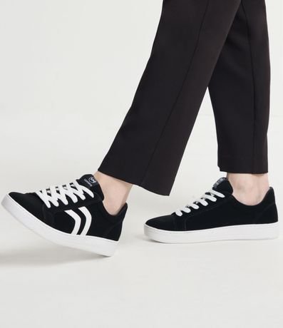 Ref: Tênis texturizado com efeito suedine, com cano baixo, cadarço para amarração e recortes laterais contrastantes.