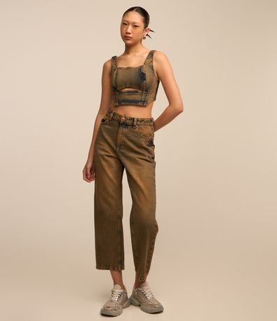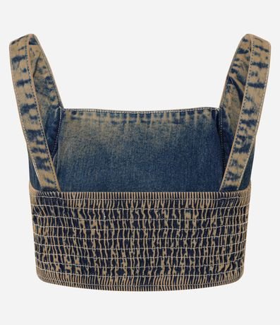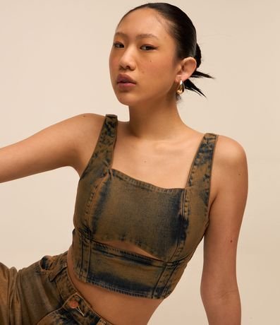 Top sem mangas confeccionado em jeans com decote quadrado, alças largas, abertura frontal logo abaixo do busto e lastex nas costas. Possui tecido com efeito de lavagem dirty washed.