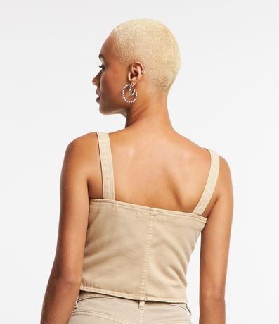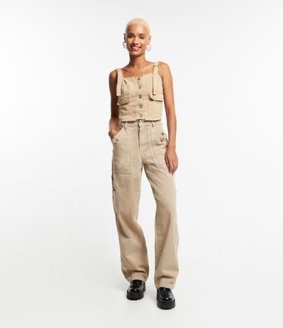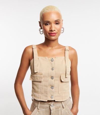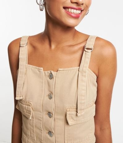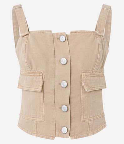 Top de alças largas afiveladas confeccionado em sarja com decote quadrado e botões na parte frontal. Possui também bolsos cargos.