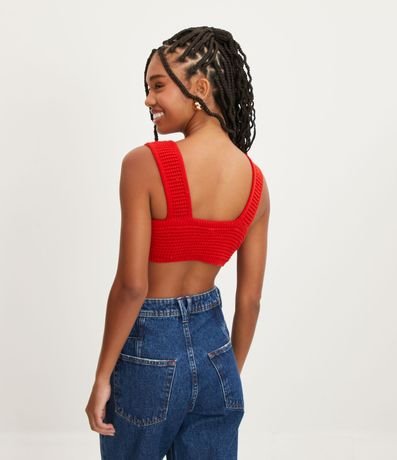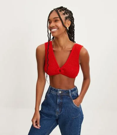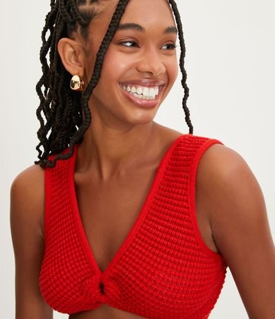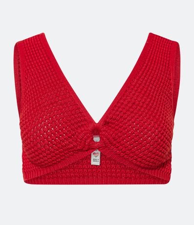 Top de alças em tricô com pontos vazados e argola no busto. Os furinhos na malha são o auge fashion deste top!