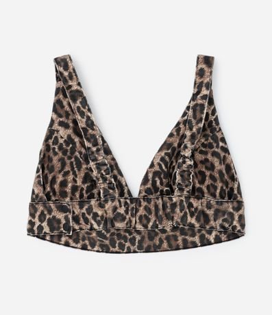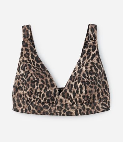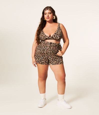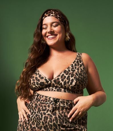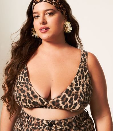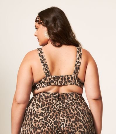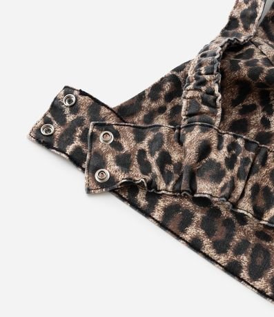 Ref: Top jeans estampado de oncinha. As alças são largas e têm elástico nas costas, dando efeito franzido. Peça com decote V e fechamento com botões por pressão.
