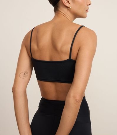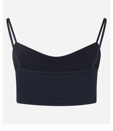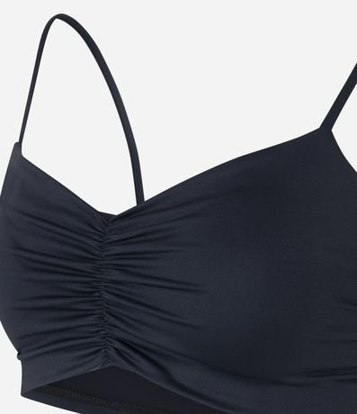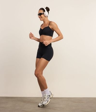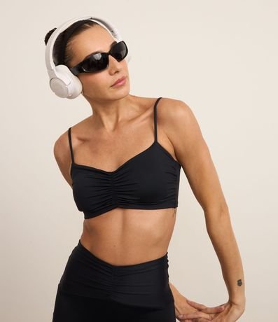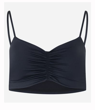 Ref: Top esportivo confeccionado em microfibra sem estampa. A peça tem alças finas fixas, busto franzido e bojos removíveis.