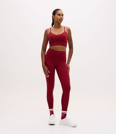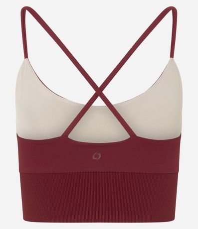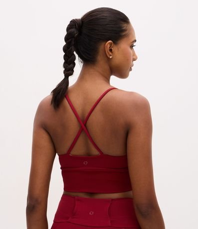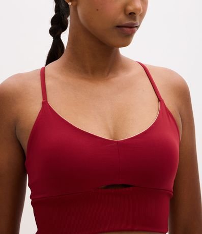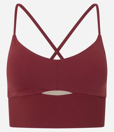 Ref: Top esportivo feminino, confeccionado em poliamida, com decote redondo, alças finas e cruzadas nas costas. A peça também conta com detalhe vazado abaixo no busto.