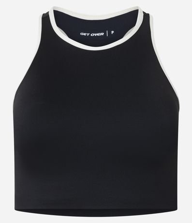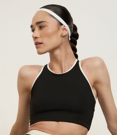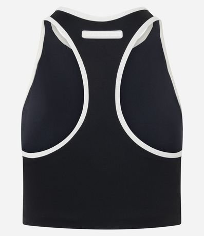 Ref: Top esportivo feminino confeccionado em microfibra através de boas práticas ambientais. Possui gola redonda, com acabamento em viés contrastantes, cavas frontais, design traseiro nadador com contorno viés contrastantes e base alongada.