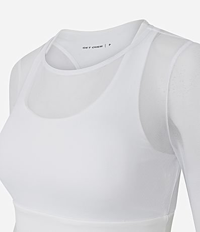 Top feminino esportivo com bojo, confeccionado em microfibra. Possui sobreposição em tule, alças largas que proporcionam maior sustentação, decote em u e costas nadadora.
