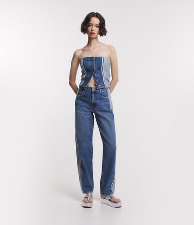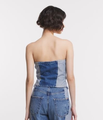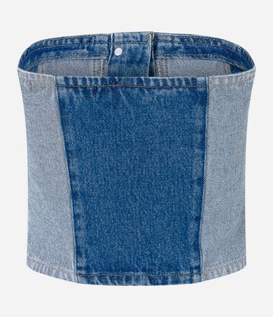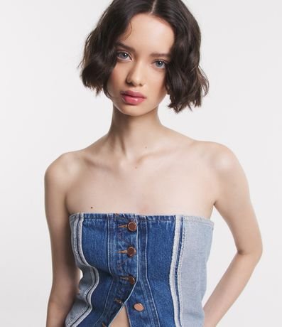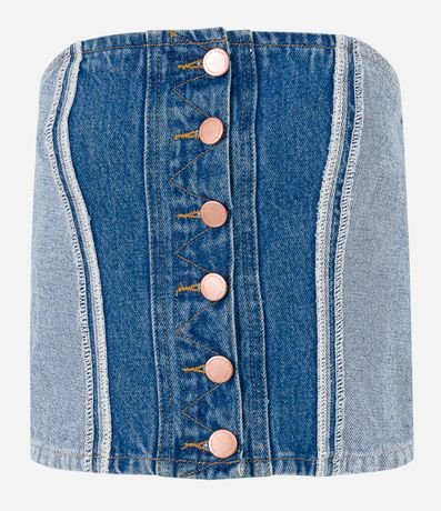 Ref: Top feminino confeccionado em jeans, com decote tomara que caia, botões frontais e recortes que imitam o avesso da peça.