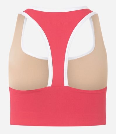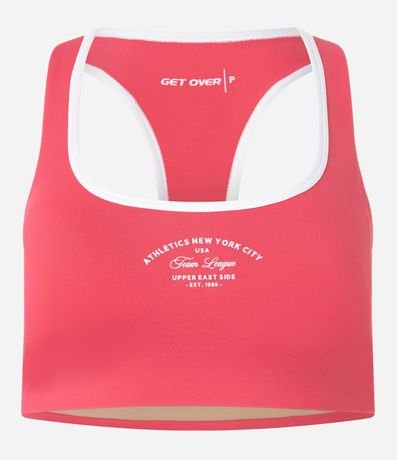 Top esportivo confeccionado em microfibra. A peça tem decote nadador nas costas, vieses contrastantes, bojos removíveis e estampa frontal "athletics new york city".