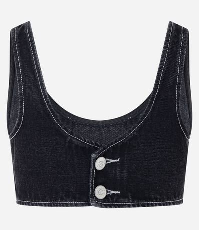 Top confeccionado em jeans sem mangas com alças largas e decote U. Conta com botões nas costas, prences frontais e costura aparente.