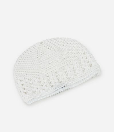 Touca confeccionada em crochê, com textura artesanal e visual moderno. O modelo apresenta pontos trabalhados que garantem charme e personalidade ao look, bem como detalhes em uma faixa vazada em sua base.