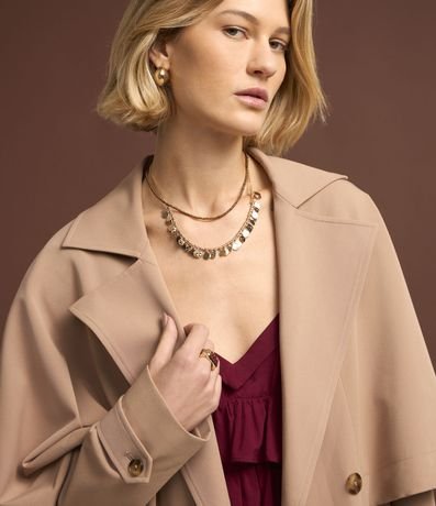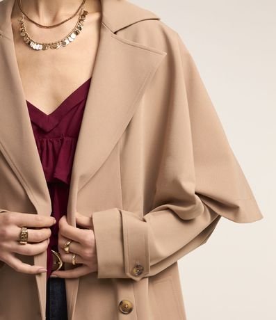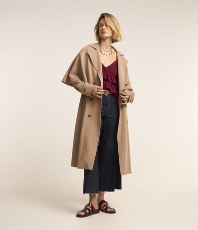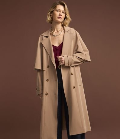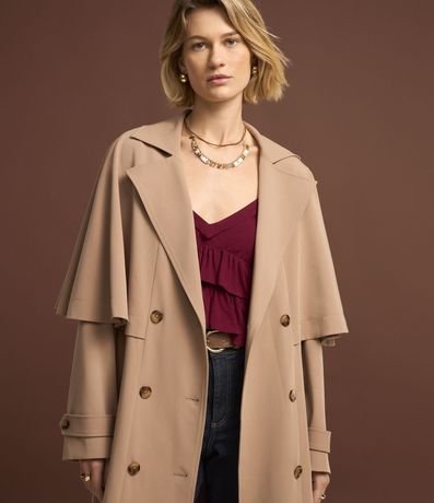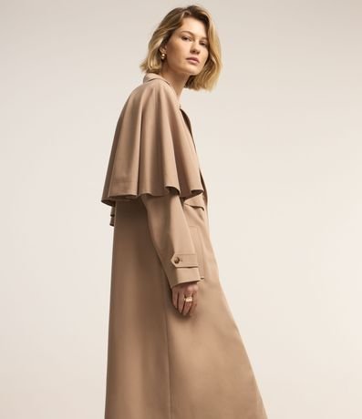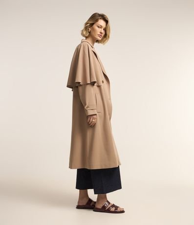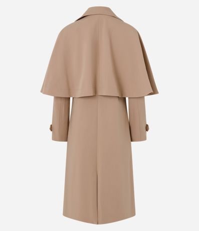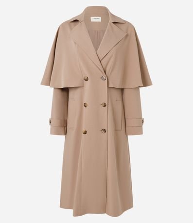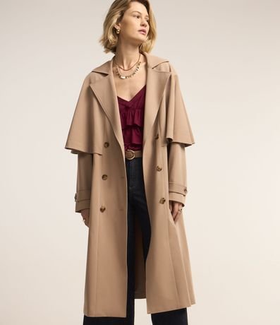 Trench coat com abertura dupla e capa sobreposta.