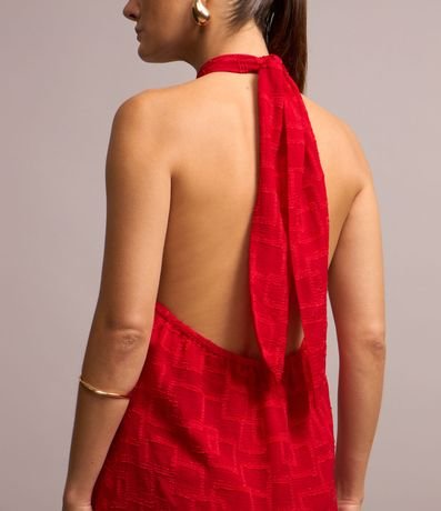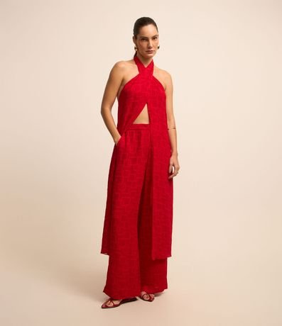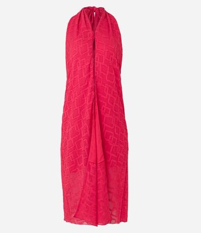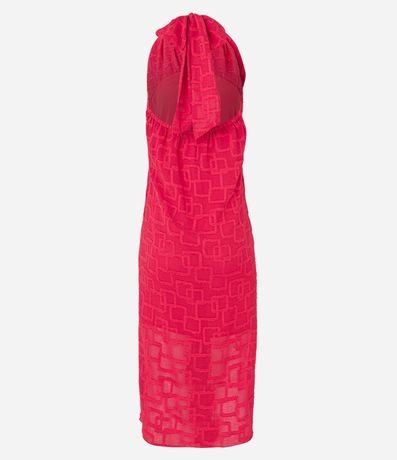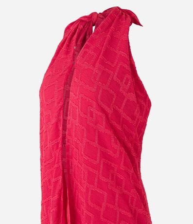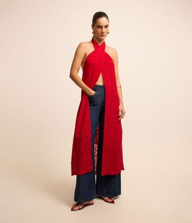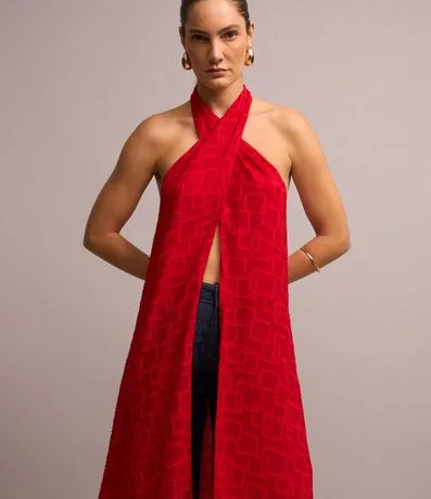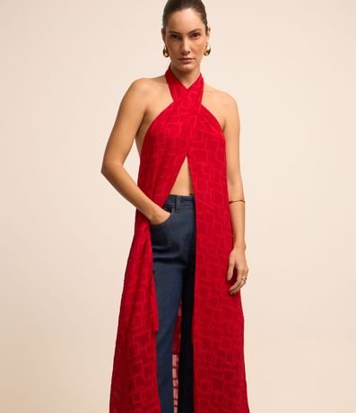 Ref: Túnica alongada frente única confeccionada em chiffon com laço no pescoço para amarração, divisão frontal e textura jacquard em formatos geométricos quadrangulares.
