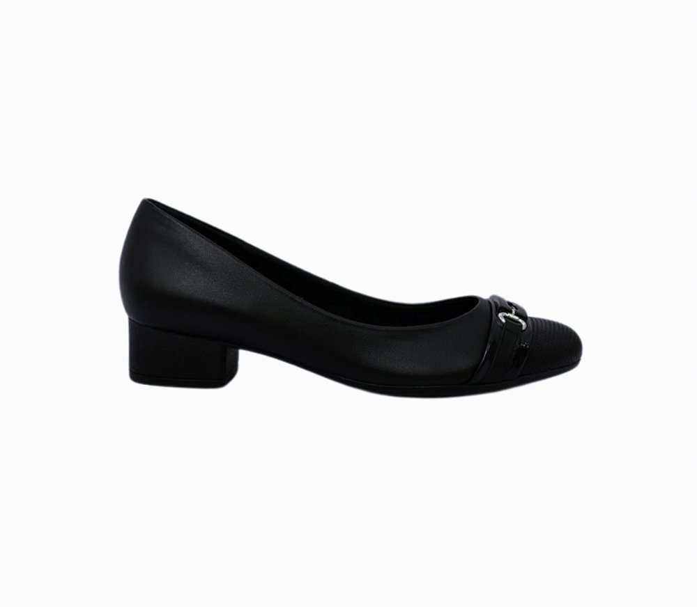 Ref: Sapato Scarpin Usaflex salto bloco em napa valise, com detalhe em estampa. O modelo possui tecnologia Memória Permanente, com material de capacidade de retorno e mantêm o formato dos seus pés na palmilha. Salto de 4,5 cm.