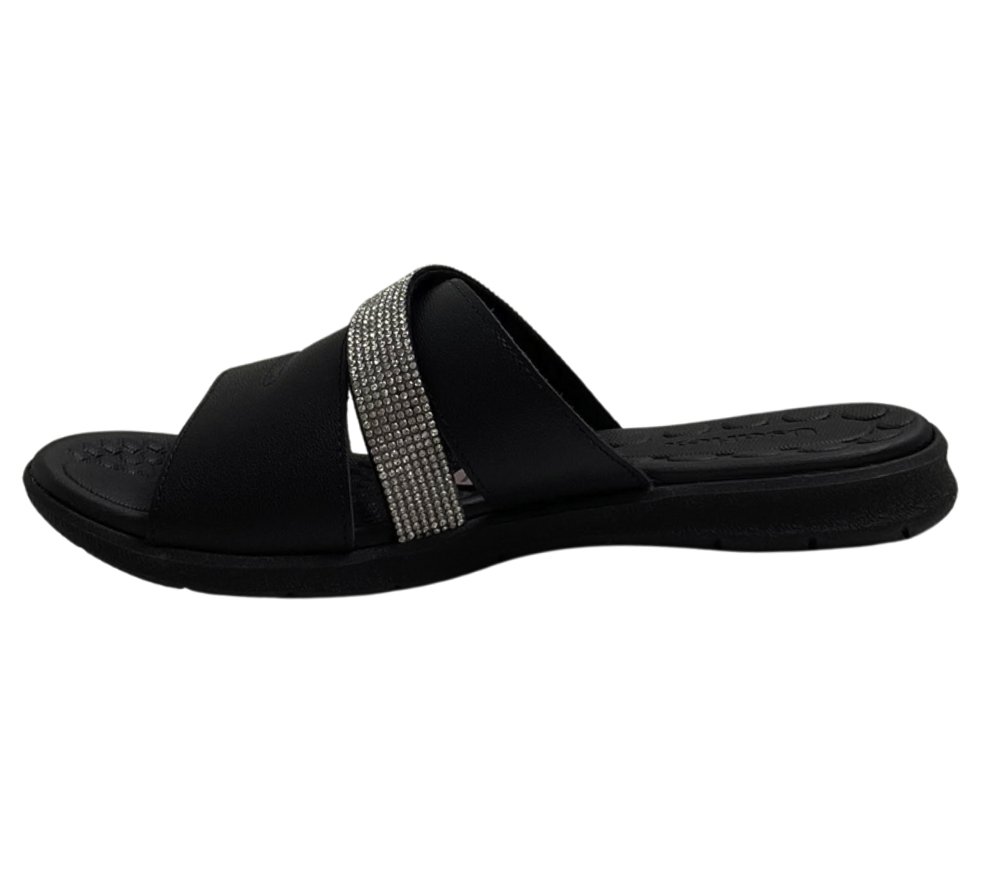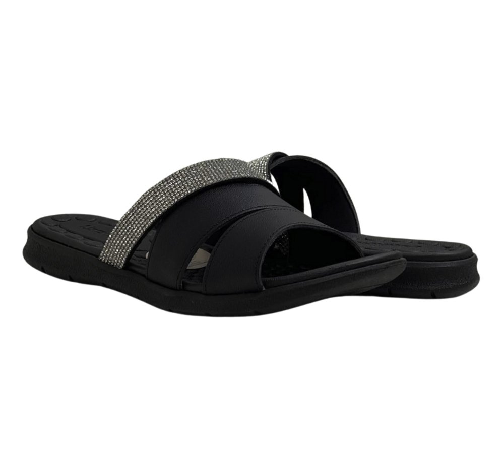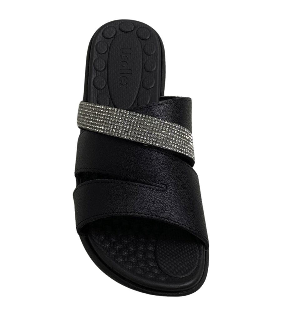 Ref: Tamanco Usaflex em couro, com tira delicada em strass que adiciona charme ao visual. Possui palmilha com esferas massageadoras, proporcionando conforto e bem-estar.