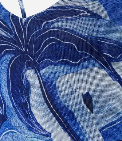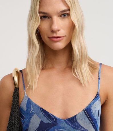 Vestido godê midi e sem mangas, confeccionado me tule, com decote V, alças finas, recorte franzido na saia e estampa abstrata que remete à coqueiros. Este produto foi fabricado através de processos mais sustentáveis, sendo ambientalmente mais responsável.