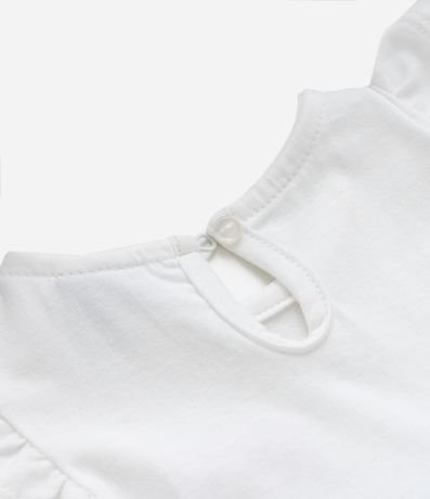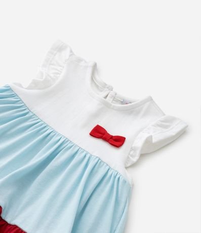 Ref: Vestidinho sem mangas em algodão com babados nas cavas. Possui lacinho no peito, blocos de cores e franzidos. Conta também com calcinha com elástico no cós.