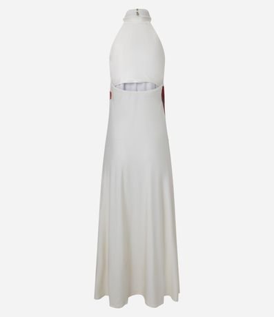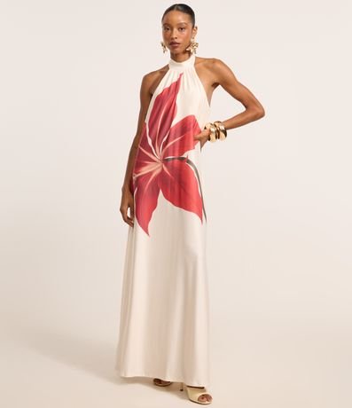 Vestido ajustado longo, confeccionado me microfibra, com gola halter, abertura nas costas, franzidos e uma grande flor estampada na frente. Este produto foi fabricado através de processos mais sustentáveis, sendo ambientalmente mais responsável.