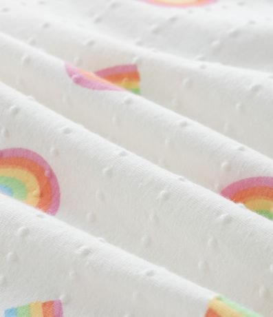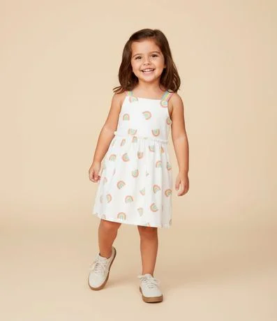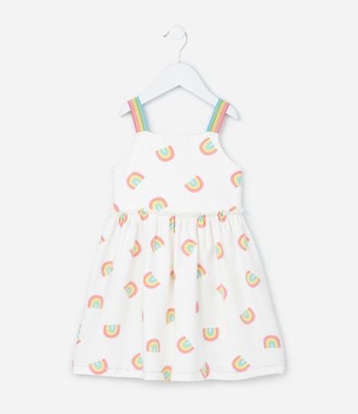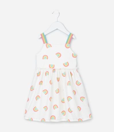 Ref: Vestido infantil confeccionado em algodão mais sustentável através de boas práticas ambientais. A peça possui alças largas, de fita, com estampa de arco-íris e texturizado.