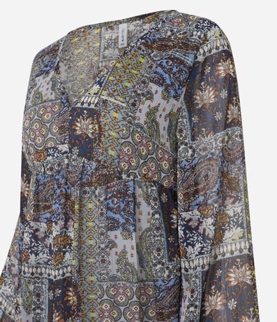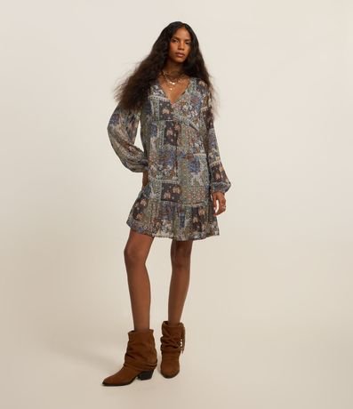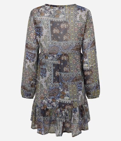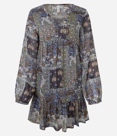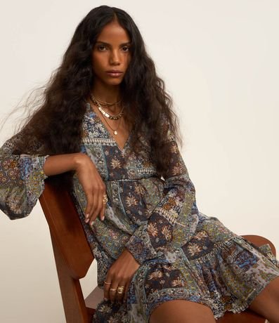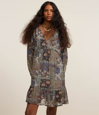 Ref: Vestido amplo confeccionado em chiffon com estampa paisley moderno. Peça com mangas longas, gola v e babados na barra.