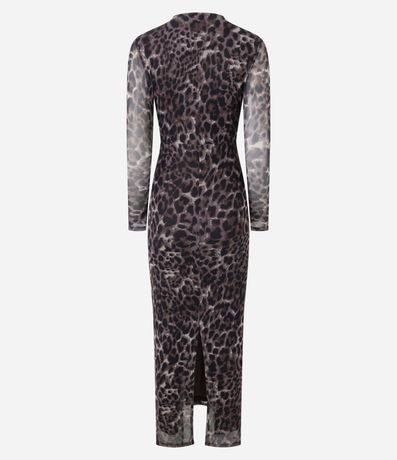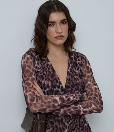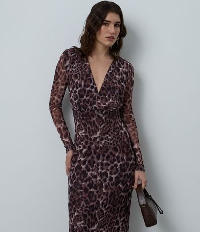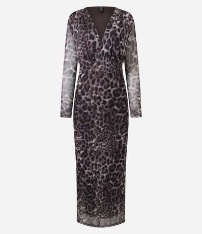 Ref: Sair e arrasar em suas festas e happy hours requer um look glamouroso, que vai realçar ainda mais o seu brilho em suas noites incríveis. Este vestido feminino é confeccionado em tule com estampa animal print fullprint, trazendo leve transparência e visual sofisticado. O modelo possui manga longa, decote em V profundo e modelagem ajustada ao corpo, que valoriza a silhueta com elegância. O comprimento abaixo do joelho alonga o visual e garante um caimento fluido e sensual, ideal para produções noturnas marcantes, cheias de atitude e personalidade para viver seus melhores momentos.