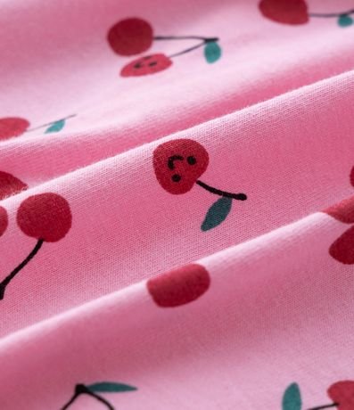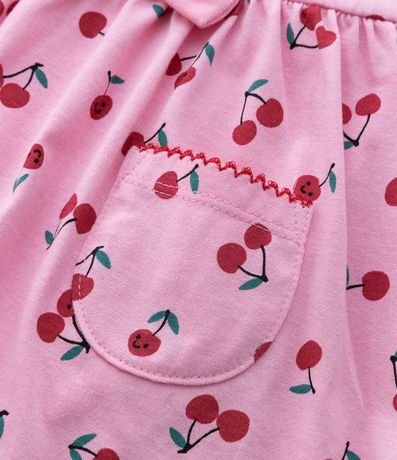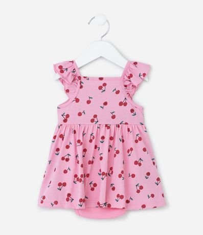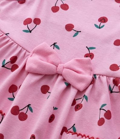 Ref: Vestido body infantil confeccionado em cotton mais sustentável através de boas práticas ambientais. Possui decote quadrado, alcinhas com frufru, lacinho na cintura, bolsinhos e estampa de cerejinhas..