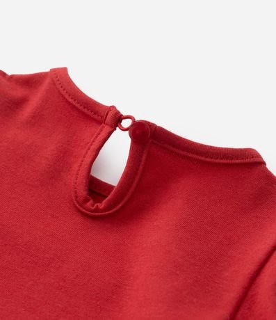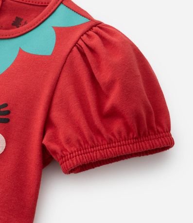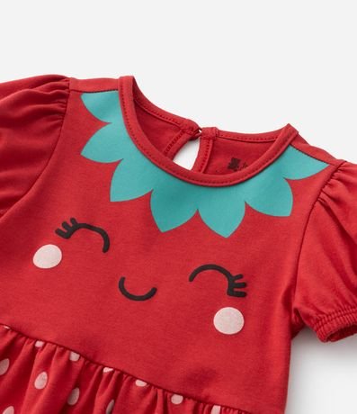 Ref: Vestido body confeccionado em algodão mais sustentável, decote recondo, manga bufante, fechamento entre as pernas, estampa de moranguinho com poá.
