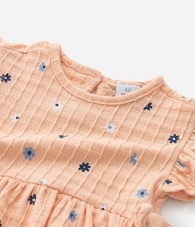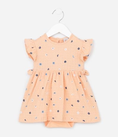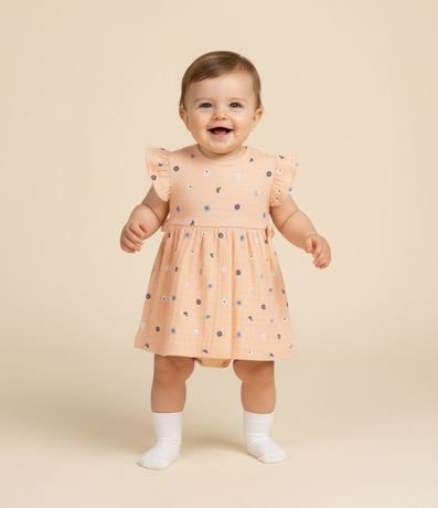 Ref: Vestido body infantil confeccionado em cotton mais sustentável através de boas práticas ambientais. Possui gola redonda, abotoamento gota, cava com frufrus, fechamento no entrepernas, estampa floral e texturizado.